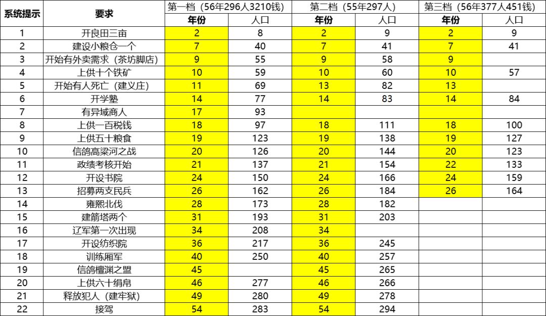 个人测了三次,第三次后面忘记了记录,可以看到圣旨和重要信息出现的时间年份基本固定,方便提前规划,具体数据如下表