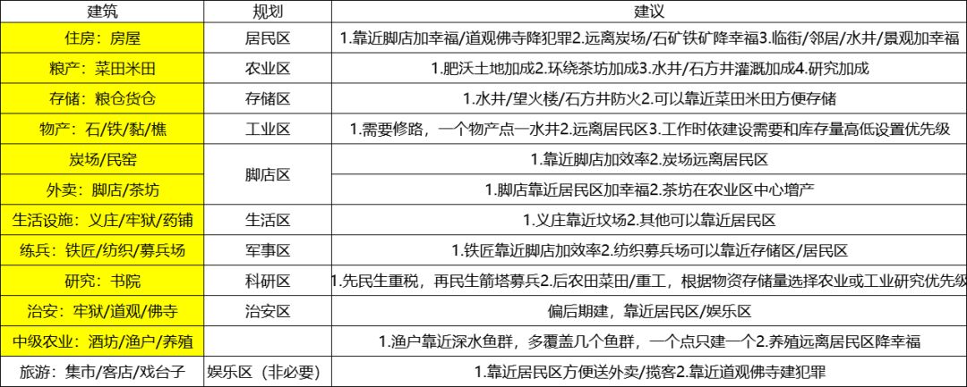 生活区、军事区、科研区、治安区,除了义庄靠坟场、铁匠靠脚店加效率,其他都可以靠近居民区见缝插针安排位置,尽量远离工业区