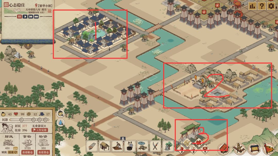 居民区和农业区是开局就确定的,农业区在县衙附近、肥沃土地,居民区在有足够空间(方便后续建更多房)、远离工业物产(开局陆地工业物产点和大致影响范围也是确定的)的地方