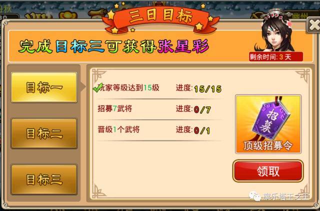二、各种方式收集武魂其他获得武将方式还有很多:签到、VIP等级奖励、竞技场、悬赏任务、节日活动等,都可以兑换获得武魂,10个相同的武魂合成一个武将,随机武魂的画,任意十个就可以合成一个随机的武将。 三、新手玩家即可免费拿到3个紫色名将现在完成3日目标,即可以获得紫色跑张星彩;连续5天登陆就赠送紫色弓手孙尚香,小伙伴们都惊呆了,赶紧来玩吧!而且顶级招募首次招募必得紫色武将,可以说小白玩家新手那3个紫色武将都是很轻松的事情。三日目标界面: