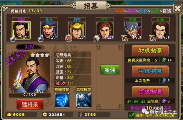 招募是《塔王之王》核心玩法之一,玩家在可以通过初级招募、中级招募和顶级招募,获得不同级别的武将,顶级招贤有一定概率获得橙色神将。主公赶紧点击纳贤,使用招募令可以获得你想要的三国名武将!初级招募令:可以获得两个武将,有概率获得良将,较低概率获得名将。中级招募令:可以获得三个武将,有概率获得名将,极低概率获得神将。顶级招募令:可以获得六个武将,有概率获得名将,较低概率获得神将。 一、免费招募,大快人心初级招募每天有5次免费招募,中级招募每隔24小时就可以免费招一次,顶级招募每隔48小时就可以免费招一次,让各位玩家不用花费元宝也可以招到更多的名将、神将。当然玩家也可以在商场购买招募令,而VIP玩家跟进等级的高低每天都会有不同的招募令赠送,就更加划算了。