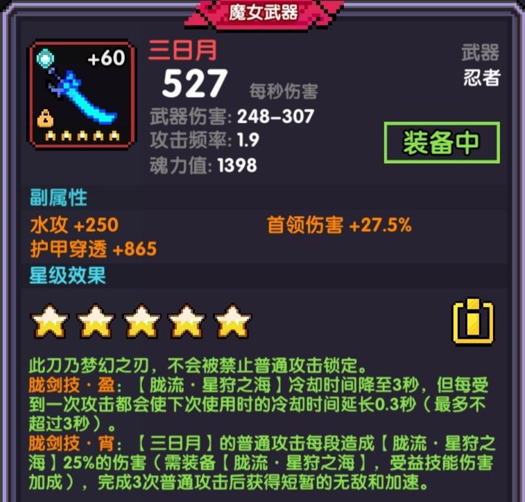 ★★★★★【三日月】的普攻每次造成【胧流·星狩之海】25%的伤害(必须装备【胧流·星狩之海】这个技能,收受到技能伤害的加成)完成3次普攻后获得短暂的无敌和加速