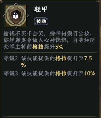 等级3:自身和所处军主将的格挡提升10%;