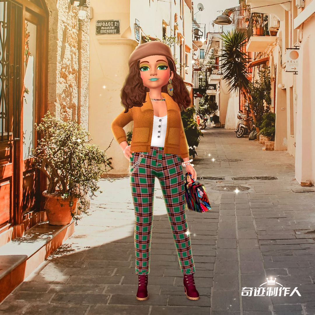 驼色毛呢外套搭配同色系复古贝雷帽,加上与妆容呼应的绿色格纹长裤,穿上这套就是整个拍摄现场最cool的导演~