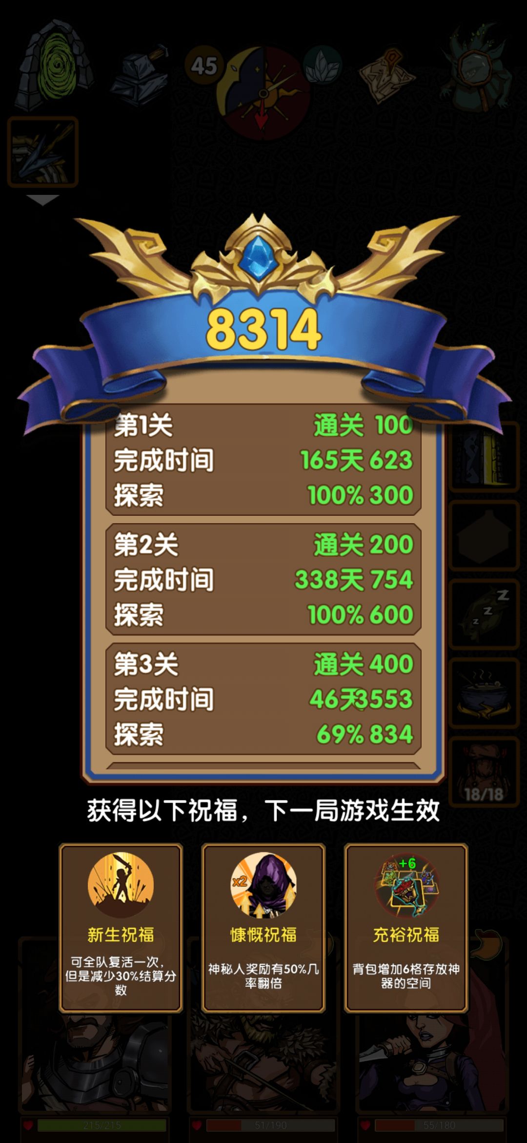 第一关和第二关,每关干到200天,第三关只去给武器和装备附魔,其他随意,因为已经无敌。只留一个神器夜光杯,其他的全分解出材料留着附魔武器装备。附魔只要祝福的,和野蛮的。装备全4级装满最大的石头再选最好的属性,再附魔,顶级吃的满背包,然后第三关,横着走!竖着走也行,见谁干谁!谁强干谁,能抗住一回合的怪屈指可数,最强的boss也是几个回合boss要不是运气好控的连手都出不了,然后就是无敌是多么寂寞!然后再干啥?然后再换个游戏呗