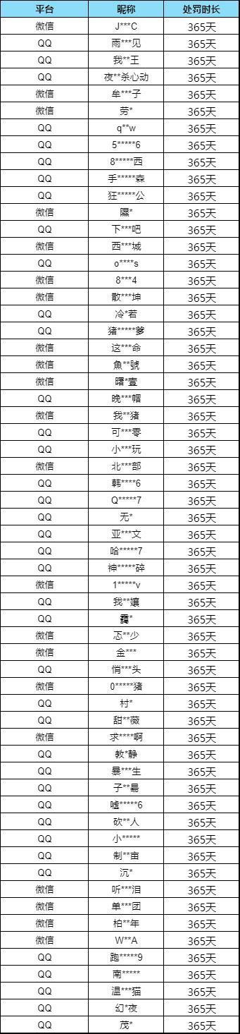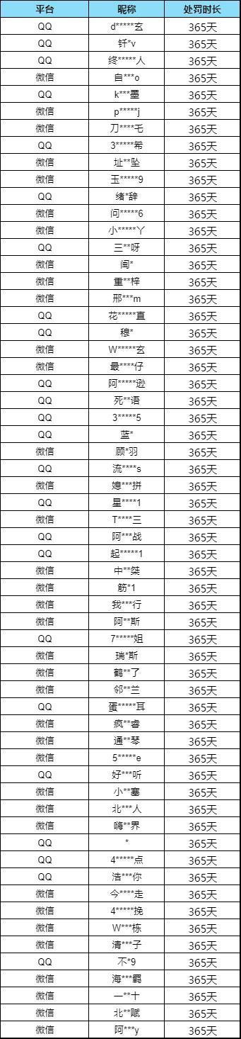 10月31日至11月6日期间,共处罚5936个作弊账号,以下为部分账号公示: