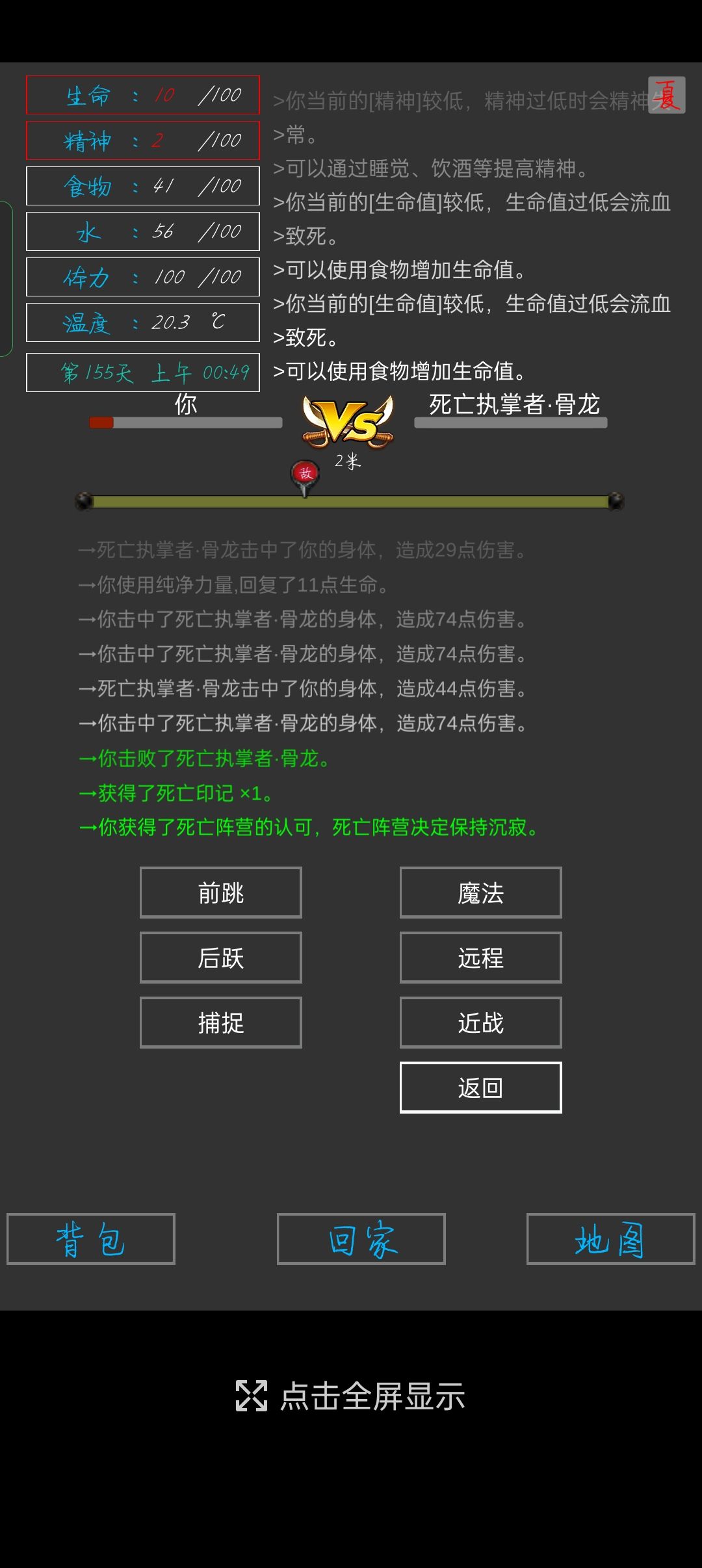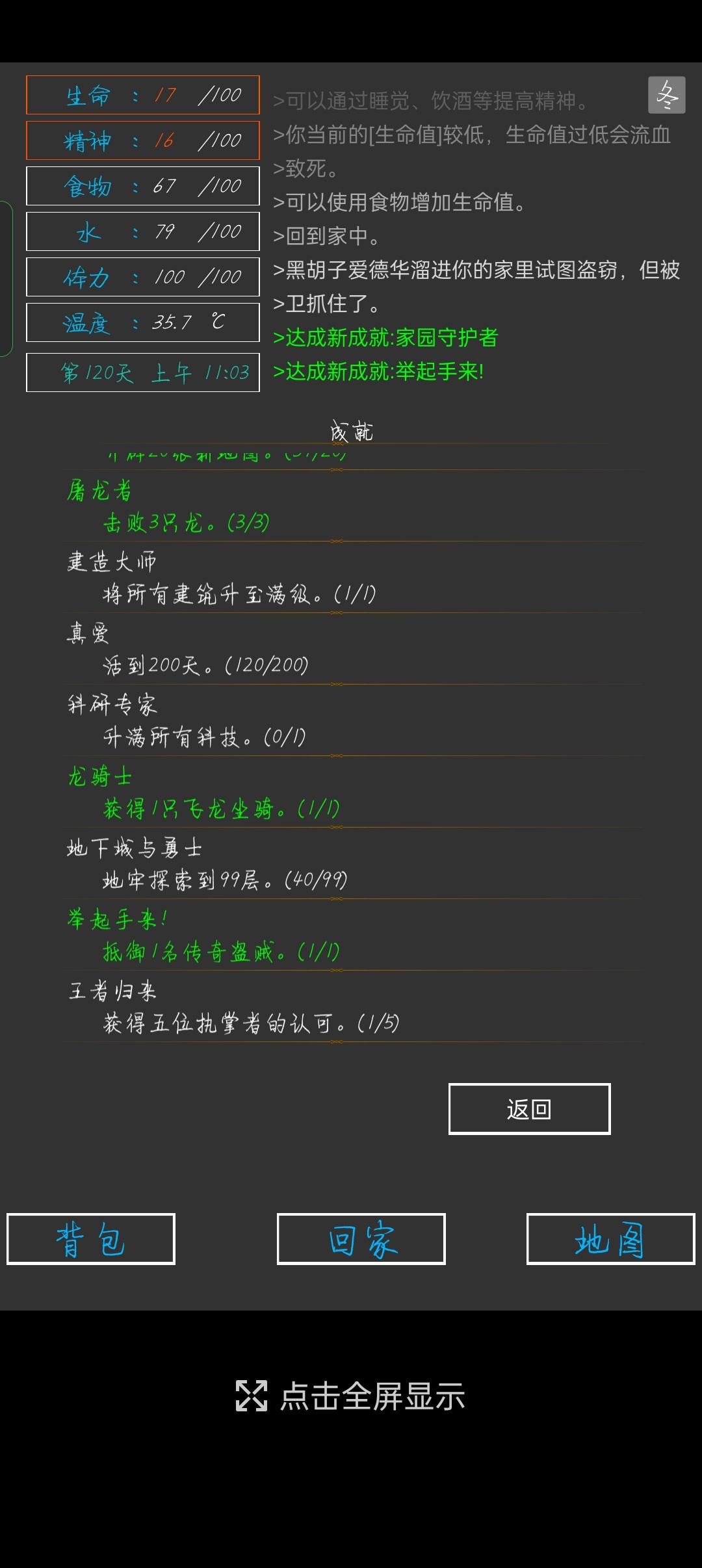 2有人说灵魂石很缺,但其实有办法刷的,在晚上,体力用完的情况下,一直点需要体力的工作,他会提示你体力不足,但是一直点的话是可以出幽灵的。并且操作过程中游戏时间不变,食物,水等属性都不会减少,并且幽灵血薄,基本近战一刀秒,不会扣血,顶多被偷袭稍微扣一点血,等于是仅拿极少量的被偷袭的血白赚大量灵魂石。