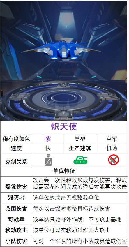 炽天使重型轰炸机,本期唯一空军。大家看这单位特征,花里胡哨的,绝对是目前所有军队中的天“花”板,特征多,意味着操作意识复杂,它甚至能对友军造成伤害。所以,炽天使堪称高APM玩家的福音,密集进攻战术的克星,不但具有高爆发伤害,还有周围一圈的范围伤害,同时具备移动中攻击属性。当然,炸弹威力太大,您需要注意到友军的安全。操作的时候,如何掩护、如何轰炸,都是需要较高技巧哦。