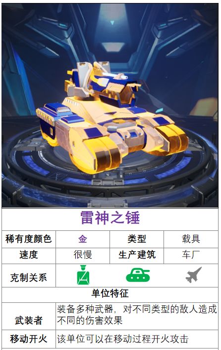雷神之锤,版本正确答案!结实厚重的构造,让它拥有极强的战场生存能力,同时装备对士兵的专属武器,让士兵反坦成为泡影。它是载具中的王者,同时面对空军也有一战之力,当它出现在战场,就标志着收割时代的到来。不过,高昂的造价意味着需要双资源收集的支持,前期有点拖节奏,但请相信,高科单位物超所值!