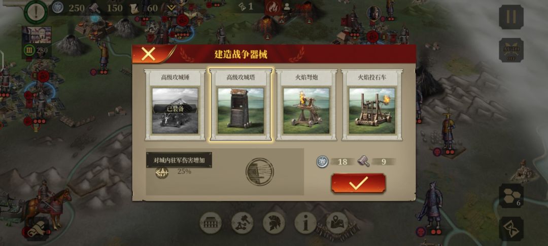 攻城塔,我认为很牛的一个攻城器械,只有对驻军加伤25%,就是你骑C去攻城,打城内兵就有25%加伤,弓将不带这个
