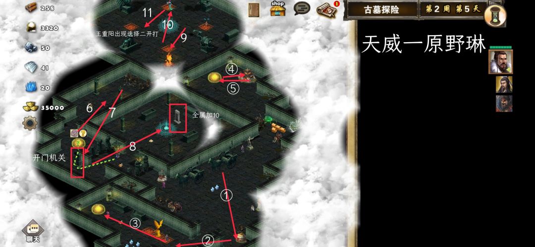 战术卡:战前准备、准备就绪、木工术、炼金术。进入地图太史慈把射手升级鹰卫全部分组,然后看见曹操被困在下面,把守卫打掉救出曹操(注意这个守卫的兵是随机的,最好不要有朱雀,不然太史慈在朱雀行动之前如果不能把朱雀灭掉,鹰卫就会被朱雀灭掉几组,一般有朱雀一下子不好杀死),然后往右边一点有个哨塔可以加10防御,如果太史慈可以点亮4技能,这个哨塔可以不打,不然就乖乖打了,继续往右上看见一个神像打掉守卫访问神像选三全,继续往右上走把堵路小怪打掉。继续往前走看见一个boss千年朱雀(出手速度9血量11240),曹操开大然后把朱雀冻住,太史慈和鹰卫一顿射就完事了,旁边有个神庙可以访问,根据需要选择属性吧。进传送阵进去,往上把堵路朱雀清掉往右走又看见一个boss千年神雀(出手速度10血量11340)打法和前面千年朱雀一样,然后可以看见右边有一个英雄(注意这个英雄是随机的,如果不是郭嘉就重新来过,当然是其他武将也可以打,最后在说怎么打)对话加入队伍。往左走喝井水补篮,传送阵旁边可以看见boss李莫愁(出手速度11血量6480)曹操开大冰李莫愁,太史慈鹰卫随便射就过了,旁边有一个古墓机关激活了,可以下面的门打开了。进去看见一个boss千年神龙(出手速度7血量9490)把路堵了,这个boss没什么难度,随便打就过了,进去房间可以看见有两组兵如果是射手就拿一组升级鹰卫,还有一个时空隧道后面还有一个石碑,先访问石碑然后进入时空隧道被传入中间一个房间里可以看见房间里有三个人,上面林朝英魂魄(出手速度14血量12360,不会主动攻击)带着小龙女(出手速度11血量6420)和164散仙,下面李莫愁魂魄(出手速度11血量6480会主动攻击)带几组兵,右边小龙女不会单独行动。过去打林朝英魂魄,注意林朝英魂魄装备有朱雀羽扇,sl林朝英魂魄出手不用扇子,曹操开大把郭嘉扔过去,太史慈开大万箭齐发射对面散仙,郭嘉全体冰冻,鹰卫射射射就完事了,打死林朝英魂魄后左边会出现王重阳魂魄(出手速度16血量12610)带着600仙术师。先过去把李莫愁魂魄打了然后过去上面喝水补蓝,过去和王重阳魂魄对话,如果选一就直接过关了,选二需要打败王重阳魂魄才能过关,sl王重阳魂魄不用朱雀羽扇,曹操开大把郭嘉扔过去,太史慈开大万箭齐发射仙术师,郭嘉冰冻全体,鹰卫射王重阳魂魄,第二回合集火把王重阳魂魄灭了,仙术师逐个击破就过关了!下面说说如果第三个英雄不是郭嘉怎么打,如果第三个英雄是物理攻击的英雄,需要装备骨饰咒链和绝影,曹操开大兵法书点王重阳然后冰冻王重阳,第三个英雄跑过去贴身王重阳魂魄,太史慈开大万箭齐发射仙术师鹰卫全部射王重阳魂魄,然后你会看到仙术师给王重阳魂魄加血一次只有100多点,第二回合集火把王重阳魂魄灭了然后逐个击破仙术师就过关了,如果第三个英雄是法师,曹操需要装备骨饰咒链,太史慈拿玄武之护,sl王重阳魂魄不用扇子烧,曹操开大兵法书点王重阳然后把自己扔到王重阳身边,太史慈开大万箭齐发射仙术师然后冰冻王重阳,法师打仙术师,鹰卫射王重阳魂魄,第二回合先集火灭王重阳魂魄然后再打仙术师就OK了!完美通关!