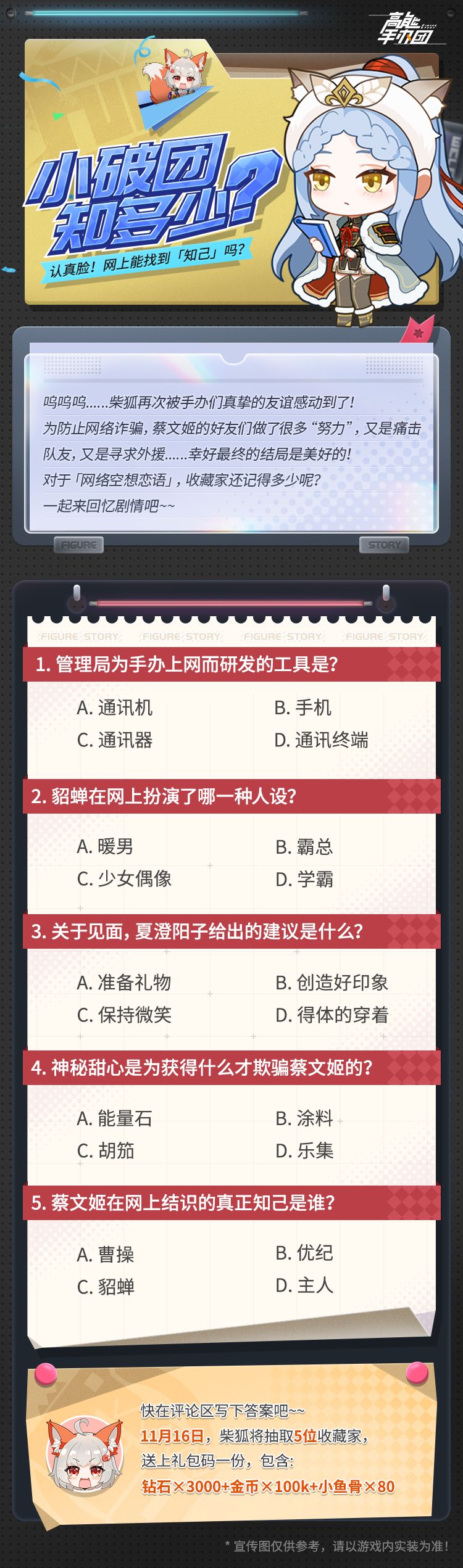 11月16日柴狐将选5位回答正确的玩家送上礼包码(钻石×3000+金币×100k+小鱼骨×80)一份!