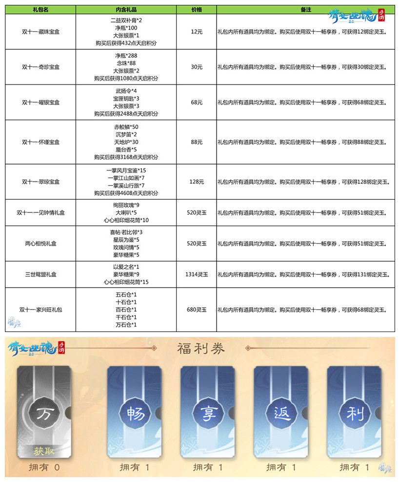 此外,玩家在活动期间完成一条龙、师门任务、帮会货运等日常活动时,还可获得双十一惊喜福利券,集齐【畅】【享】【返】【利】四字即可兑换双十一畅享券,直接使用可获得25元宝,在购买礼包后使用礼券还将获得不同数额的绑玉返利!