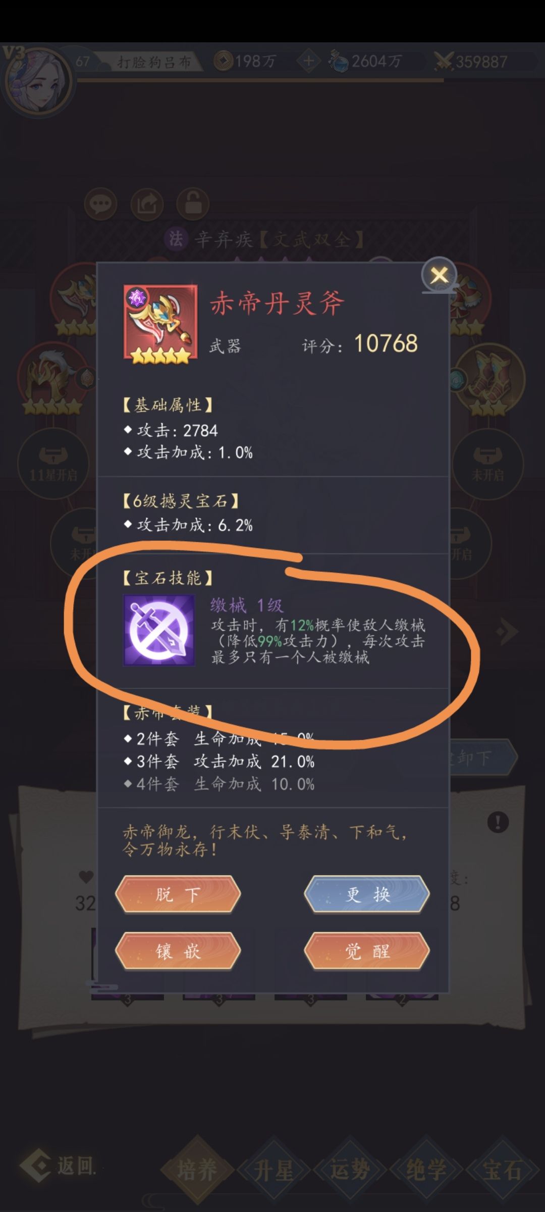 宝石副本第一章完美通关以后,会送一个武器宝石,分解掉,重新买,换成缴械给辛弃疾带上。六星缴械宝石最强,没有之一。注意宝石分解是无损的,所以不用担心。