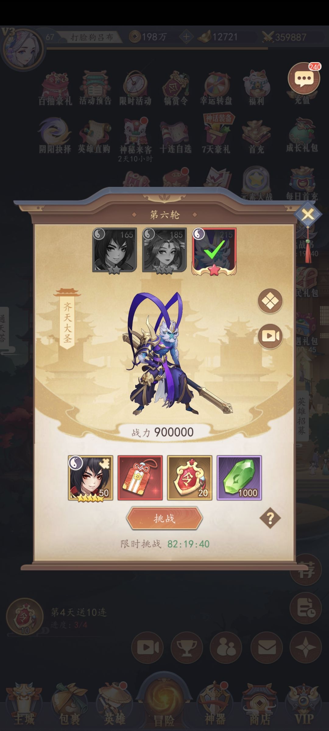 接下来重复打主线,无尽,通天。打出的令牌抽卡,碎片合成,许愿袋许愿雷希,许愿积分转换雷系英雄,这里推荐戚继光或者宁采臣去转换。这个时候只要不是太黑,会再出一个辛弃疾,加上打本送的杨玉环,现在至少两个八星。就可以过掉第三轮挑战书的白素贞。