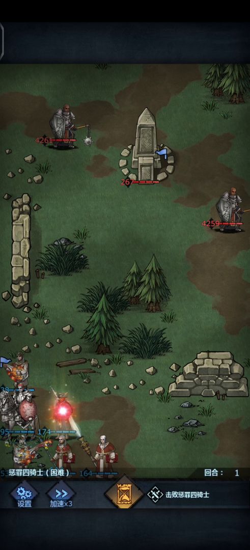 如视频十来个回合才过掉,目前配置一雷主一剑圣两飞鹰一狂热一肉(最好有格挡得),卡在两个草丛之间,剑圣伤害高可以卡最上面草丛(三回合内能反击掉对面援护),主要思路就是剑圣挨打反掉援护,两飞鹰飞过去杀掉主教借石像飞回对面下面光头仇恨范围,一般对面会优先攻击血量低得,然后这一关过去后就简单,后面剑圣堵路口,雷主收尾。