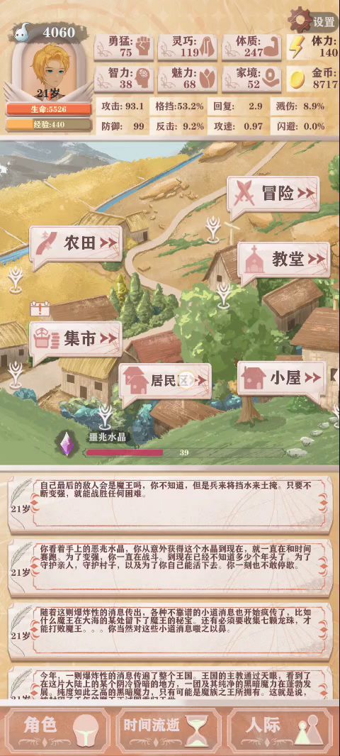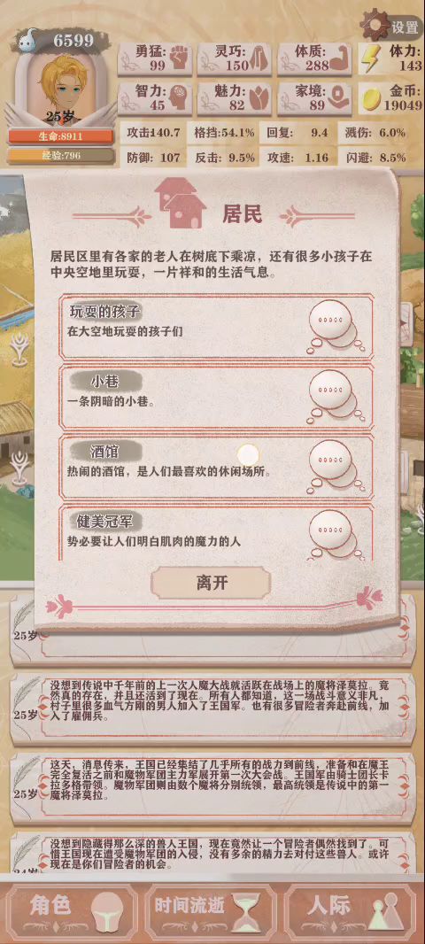 防御:健身天赋→高血量,打工赚钱叠黄金甲→高防,打工健身天赋都加体力上限,可以练很高的灵巧→高格挡