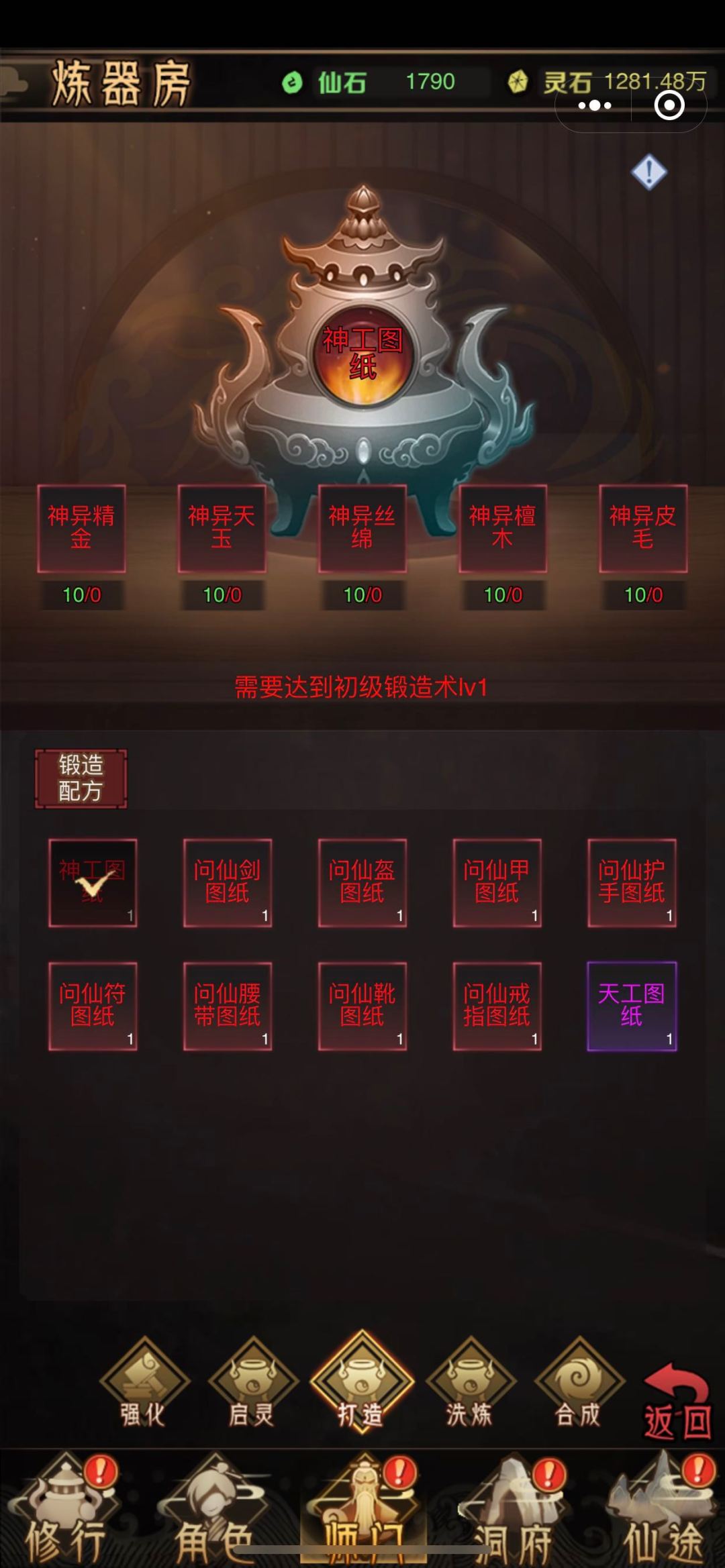 同时如果拥有装备图纸以及对应需求的材料也可在炼器房中通过打造功能打造出自身同等境界的装备,打造的装备品质与投放的材料有关。