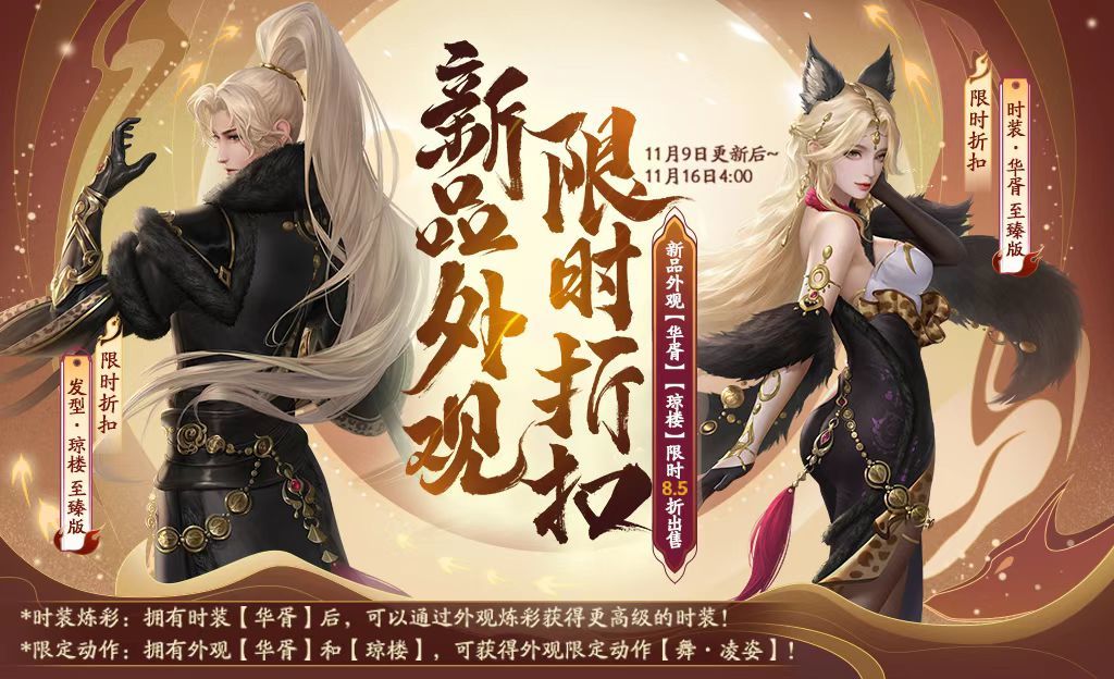 活动内容:上架新品外观【稀有发型·琼楼】和【稀有外观·华胥】,限时8.5折,活动结束后恢复原价。