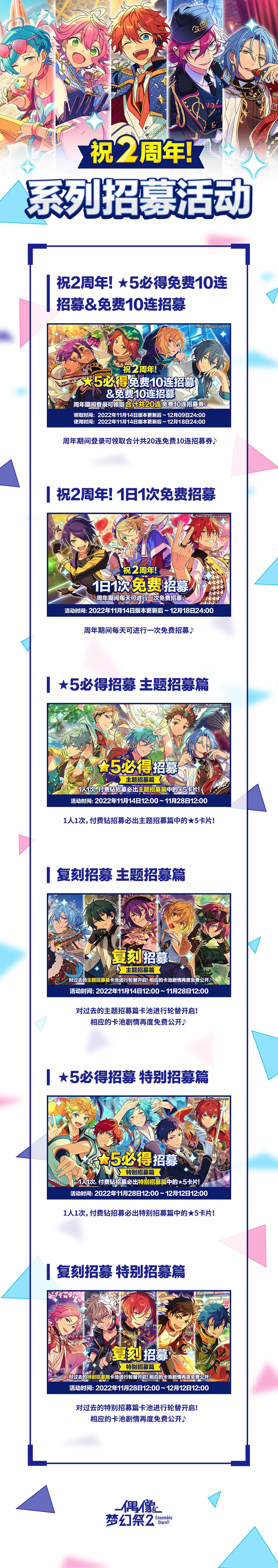 11月14日版本更新后~12月9日24:00,活动期间登录游戏可领取「祝2周年!★5必得10连招募券」和「祝2周年! 10连招募券」。