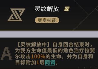 【灵纹解放A】:灵纹解放中,自身回合结束时,为我方生命值最低的角色治疗拉斐尔攻击100%的生命。并为自身和目标附加1层同调。