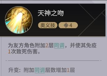 【天神之吻】:为友方角色附加2层同调,并使其免疫1次致死伤害。