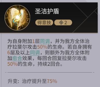 【圣洁护盾】:为自身附加1层同调,并为我方全体治疗拉斐尔攻击50%的生命(刻印提升后最高可达75%)。若自身拥有6层以上同调,则额外为我方全体附加恢复效果,每回合回复拉斐尔攻击50%的生命,持续2回合