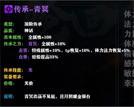 3.紫色传承【天】青冥*1 效果应该是全属性+10%