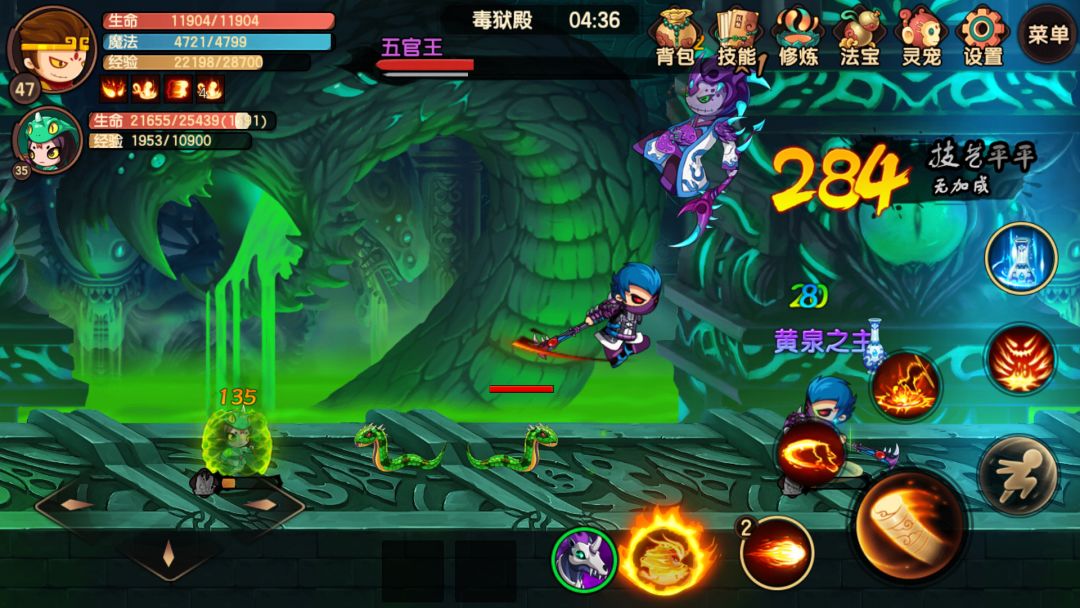 等到五官王无敌时间了,应该会放蛇,朝向宠物打,让宠物抗伤害,放完了继续上挑,无伤耗死