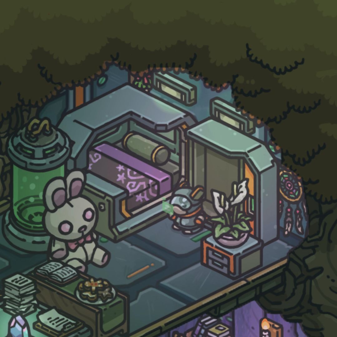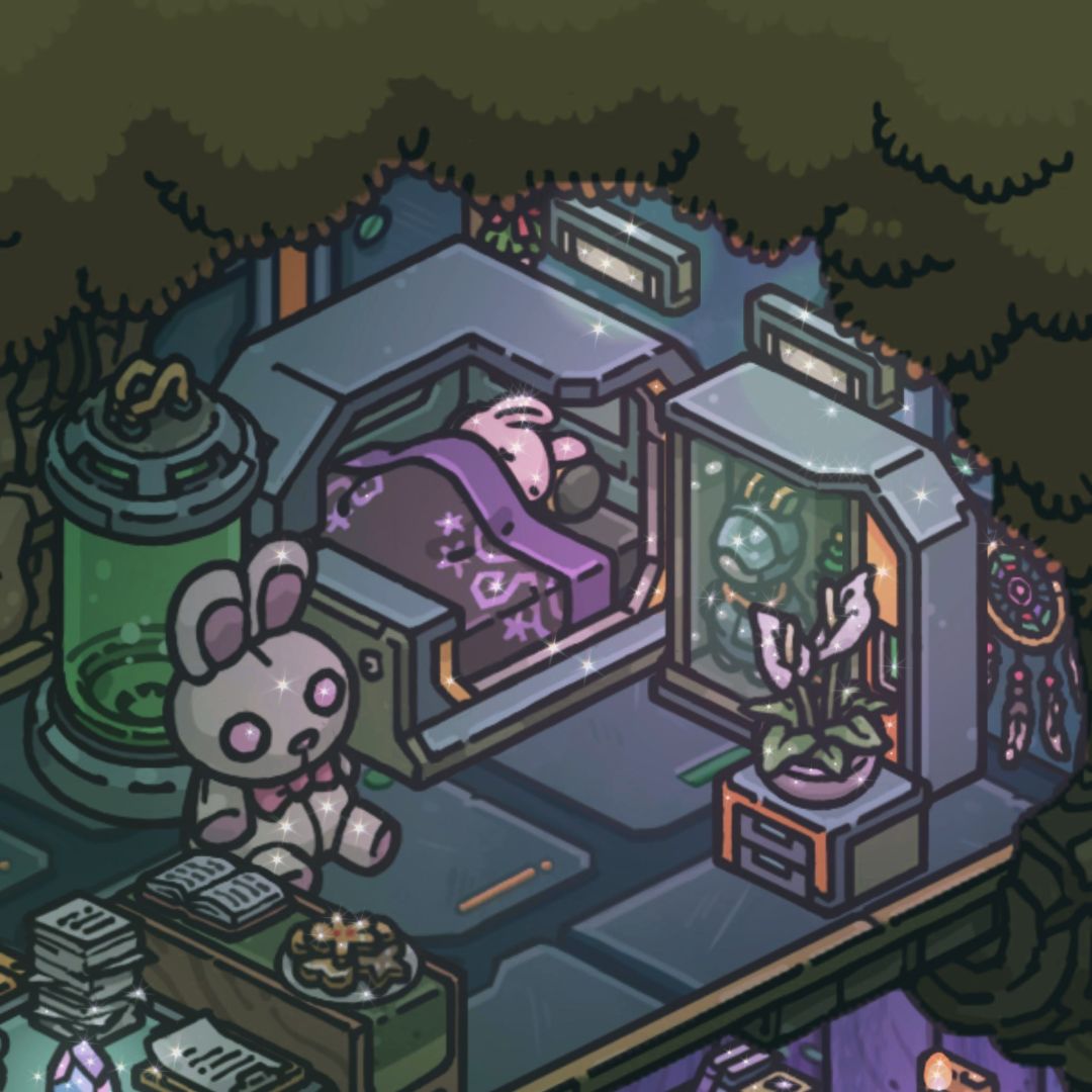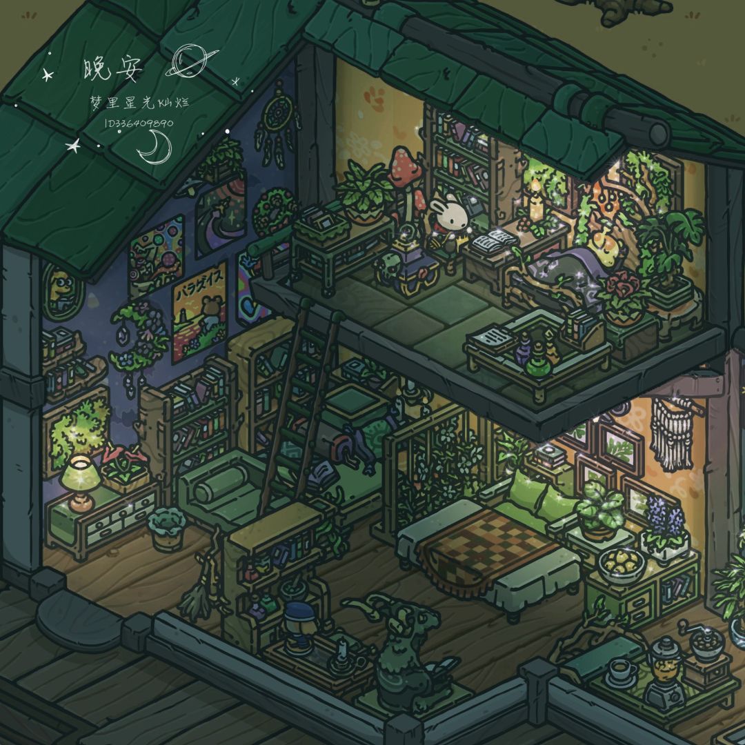 很喜欢房间被堆满的感觉,每个角落都可以是一个小世界。兔兔的树屋比较混搭,无论是自然的山野丛林还是科幻的星际城市都让人无限向往,我的兔兔要从无垠海岸冒险到浩瀚宇宙啦~总之这是一只既痴迷魔法又崇尚科技的兔子🥰