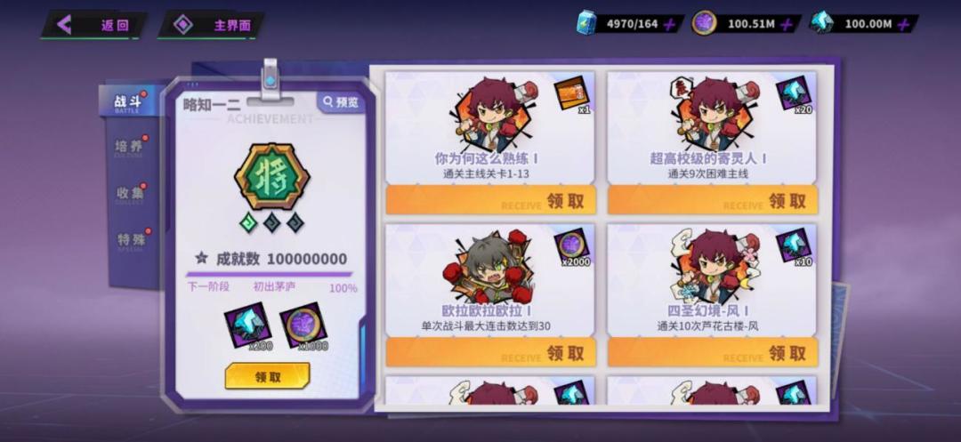成就任务包含——战斗成就、培养成就、收集成就和特殊成就4个模块。玩家在完成成就可以获得对应成就的奖励,同时也会获得一定数量的成就点,成就点数达到指定数值,还可以领取成就点数的阶段目标奖励。