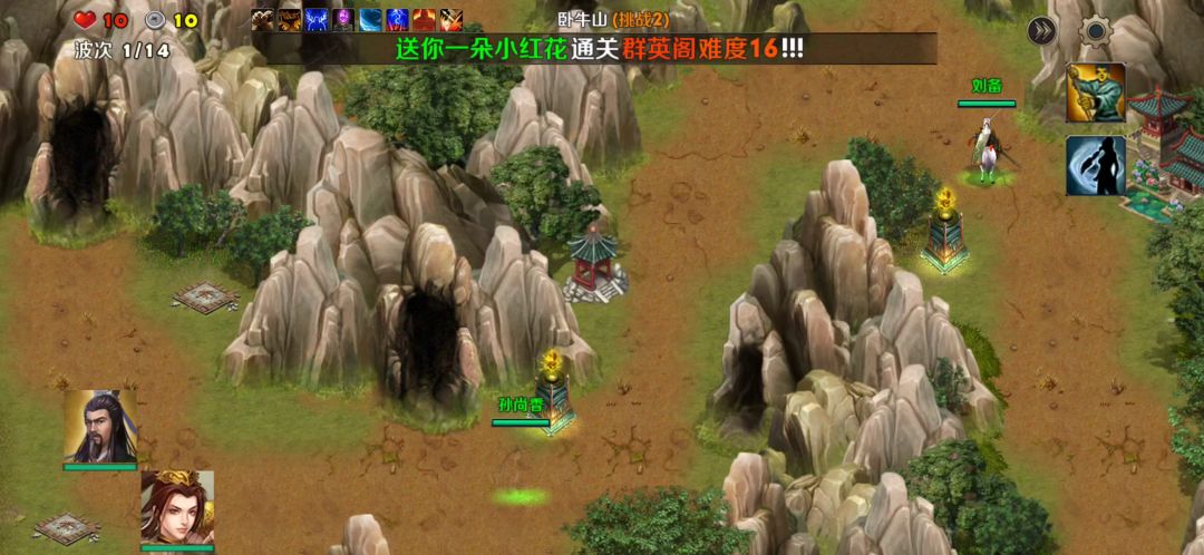 打法思路:第一波两位英雄分别站在中路和右路防守然后在旁边建造天雷塔优先把金币用在这两个防御塔升级技能上。右边防御塔升满以后英雄集合在中路右路就用刘备技能辅助防御塔杀敌。接下来就在中路把防御塔建造满,第七波、最后一波到来英雄优先击杀boss。