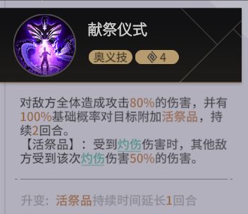【献祭仪式】:对敌方全体造成攻击80%的伤害,并有100%基础概率对目标附加活祭品,持续2回合。【活祭品】:受到灼伤伤害时,其他敌方受到该次灼伤伤害50%的伤害。