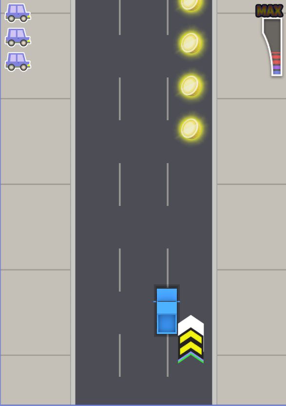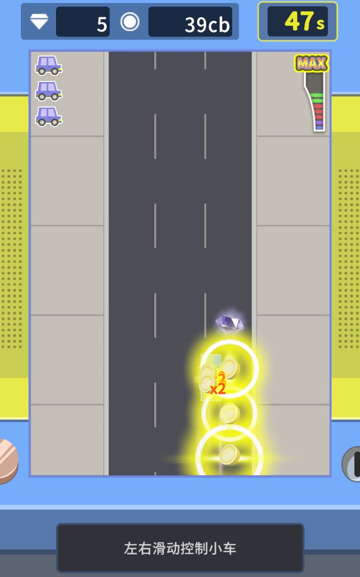 叠满速度后,右上角会显示MAX,表明车辆进入最高速的状态,在最高速状态下拾取的金币和钻石会翻倍哦!!!