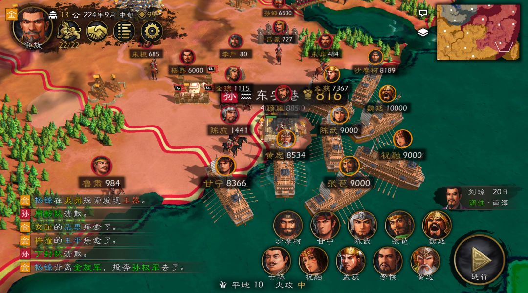 当然,如果你在附近占领一个府关港作为补给基地那最好。在这个补给基地中运输钱粮兵,一旦前线的楼船有了损失,可以立即回到补给基地附近水域迅速及时的补充,再重返战场继续战斗。
