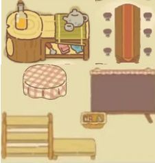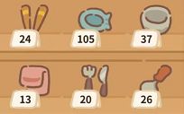餐边柜的物品:一共有6种提供客人吃饭的道具,分别是竹筷、蘸碟、瓷碗、毛巾、刀叉、勺子,还有小鱼干、铃铛、砖石、头饰、电影碎片、纪念物。