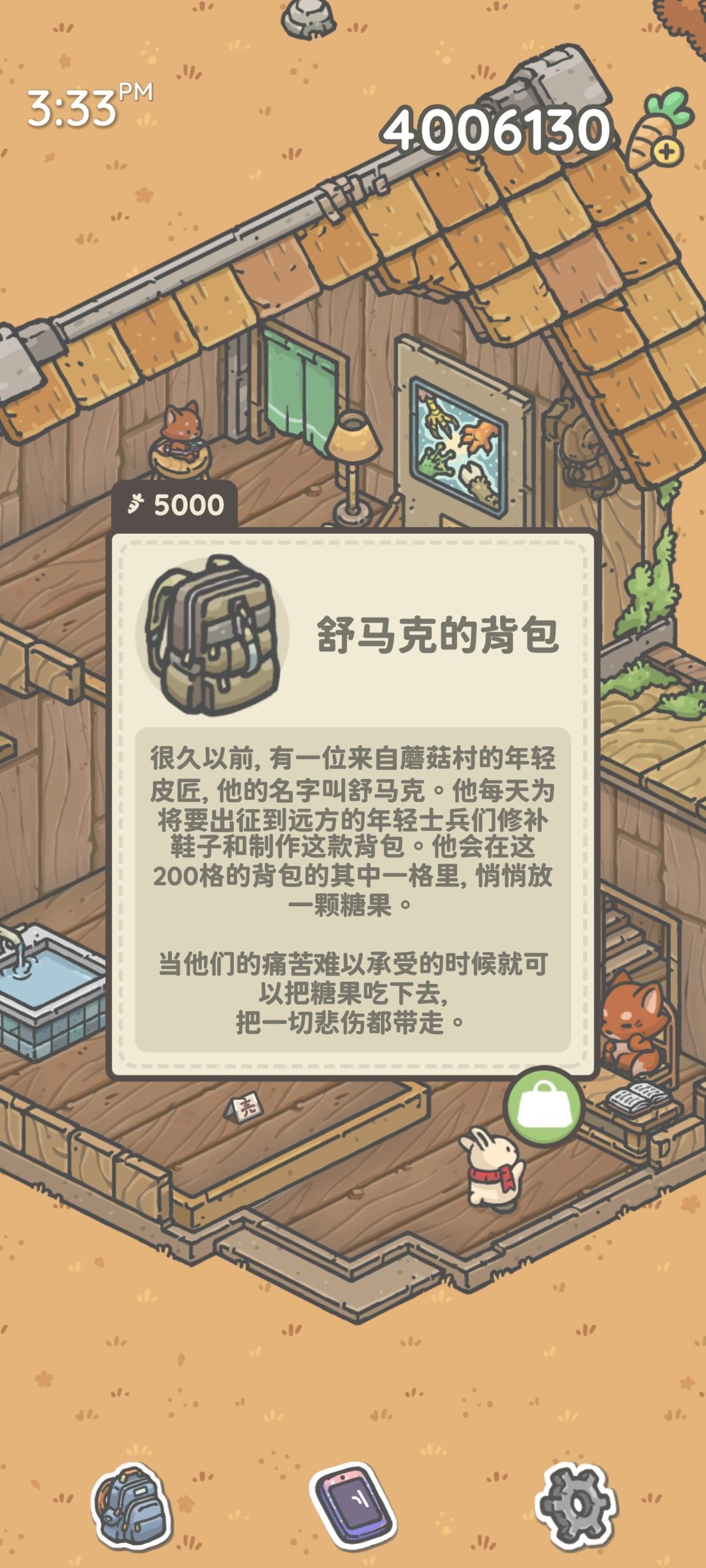 出现新的背包先不要买,卡出来bug之后再买,因为大容量背包买了以后再凑不同种有点麻烦,趁这个时候可以填满背包扩容以后可以不用再费劲将家具一个个拿出来