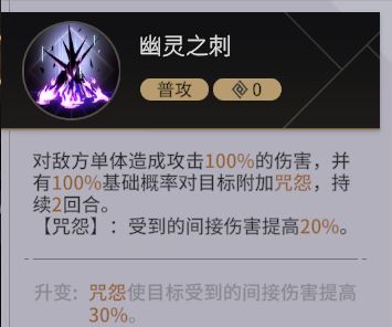 【幽灵之刺】:对敌方单体造成攻击100%的伤害,并有100%基础概率对目标附加咒怨,持续2回合。【咒怨】:受到的间接伤害提高20%。