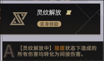 【灵纹解放A】:灵纹解放中,隐匿状态下造成的所有伤害均转化为间接伤害。