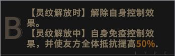 【灵纹解放B】:灵纹解放时,解除自身控制效果。灵纹解放中,自身免疫控制效果,并使友方全体抵抗提高50%。