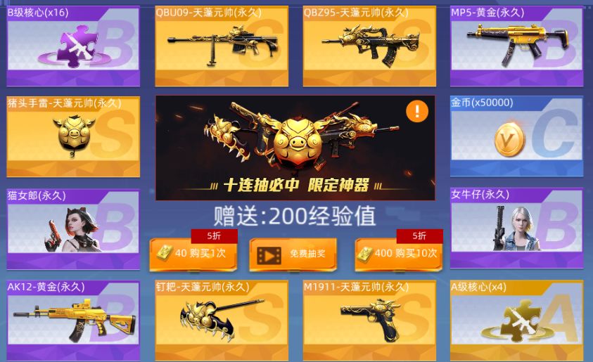 A级核心(x2)抽中概率10%猫女郎(永久)抽中概率1%女牛仔(永久)抽中概率1%AK12-黄金(永久)抽中概率1%MP5-黄金(永久)抽中概率1%