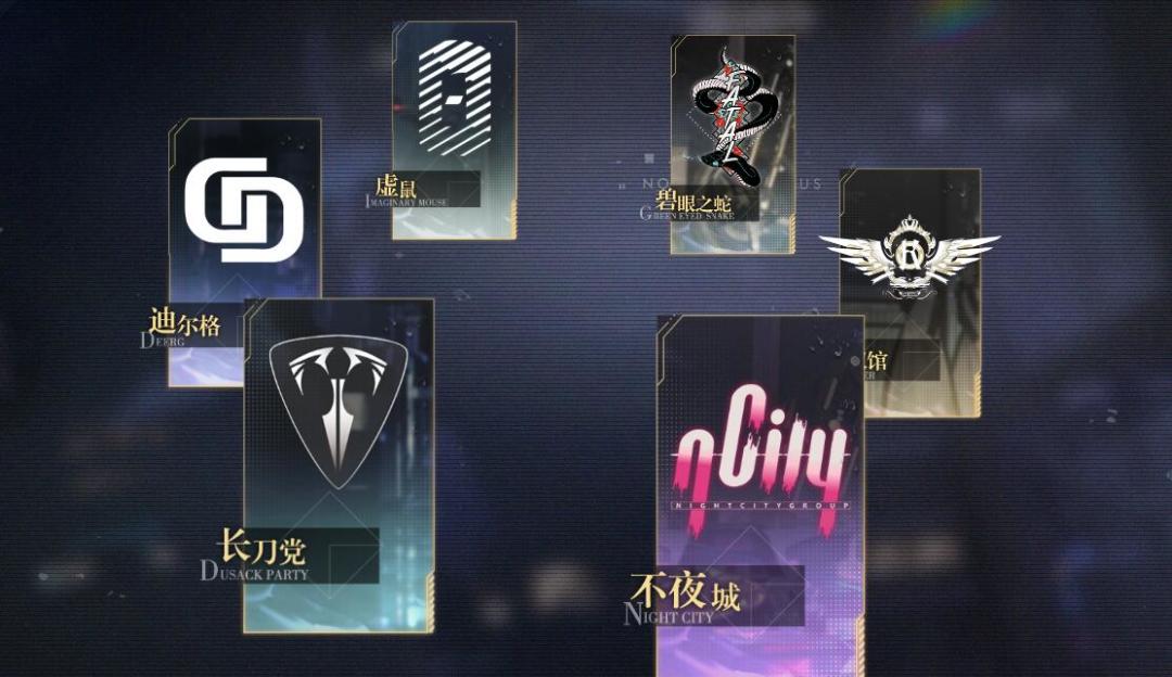 目前的游戏设定中主要有六大阵营,分别为长刀党、不夜城、王权馆、碧眼之蛇、虚鼠以及迪尔格。