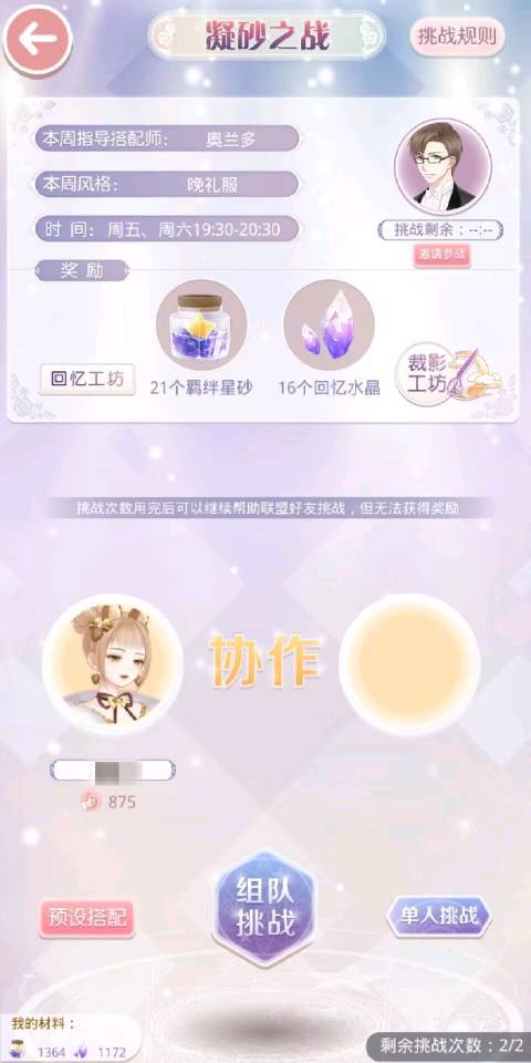 (3)搭配战:时间由联盟会长设置(如不设置默认为周六周日)19:30—20:30,可组队或单人完成,可获得羁绊星砂和回忆水晶。