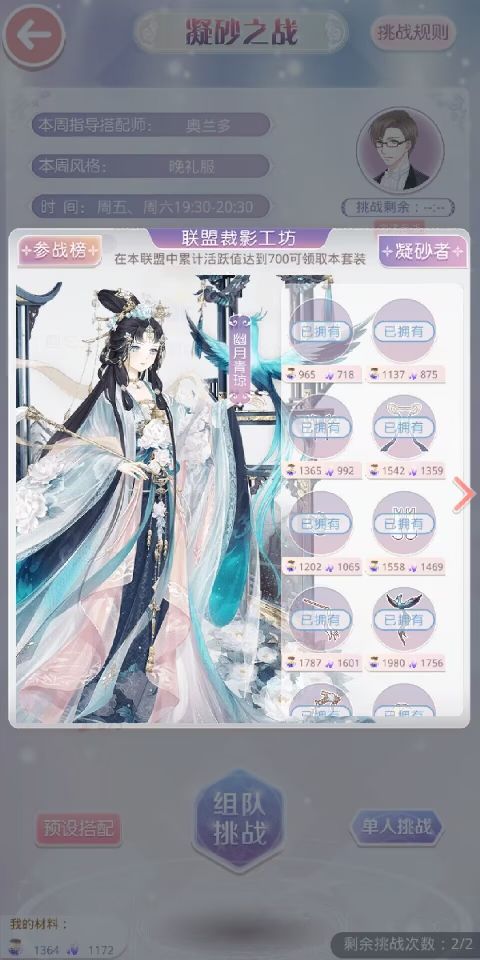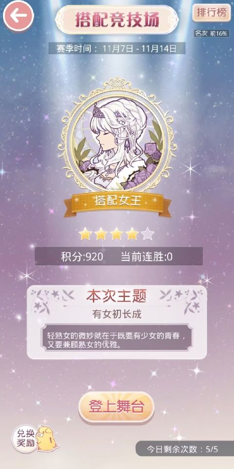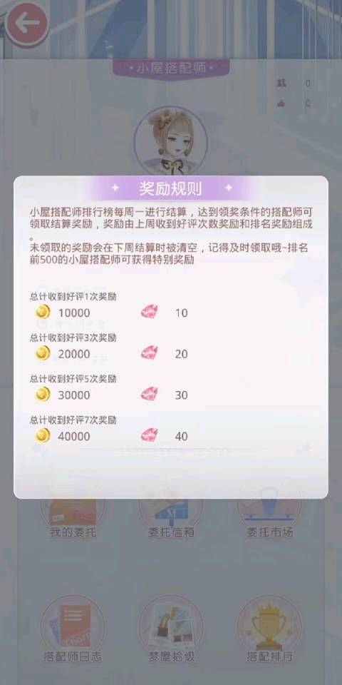 5.搭配评选赛:每周二,周六2:00结算6:00开启,结算后奖励发放至邮箱。每期搭配主题不相同,搭配师可以选择符合主题的套装进行参赛。(每十分钟可更改一次参赛套装,更改后点赞数清空)当评委点赞十次还可开盒子获得随机奖励。
