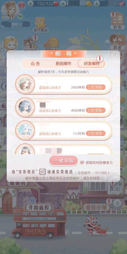 2.邮箱—好友邮件领体力(日上限为50点,每个人2点),一键送心。(邮箱满了或关闭好友送体会导致收不到好友送的体力~)