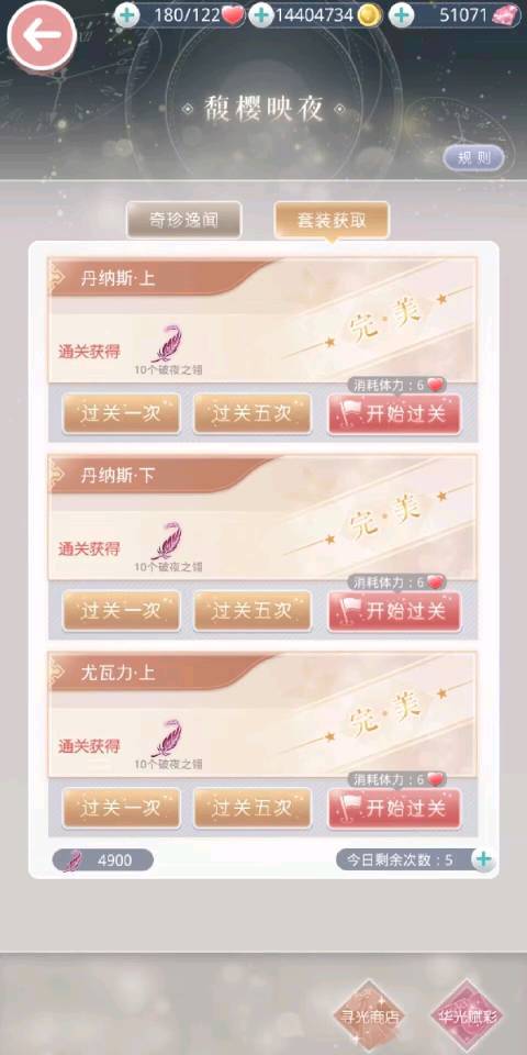 13.璀璨华光 寻光之旅:每日花费5*6体力,获得50道具。道具可在寻光商店兑换套装部件,也可在华光赋彩中收集材料制作套装。