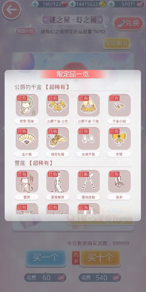 幻之阁,迷之阁免费次数每日5:00重置,使用抽奖券进行抽取可随机获得服装,运气好还能抽到限定部件~