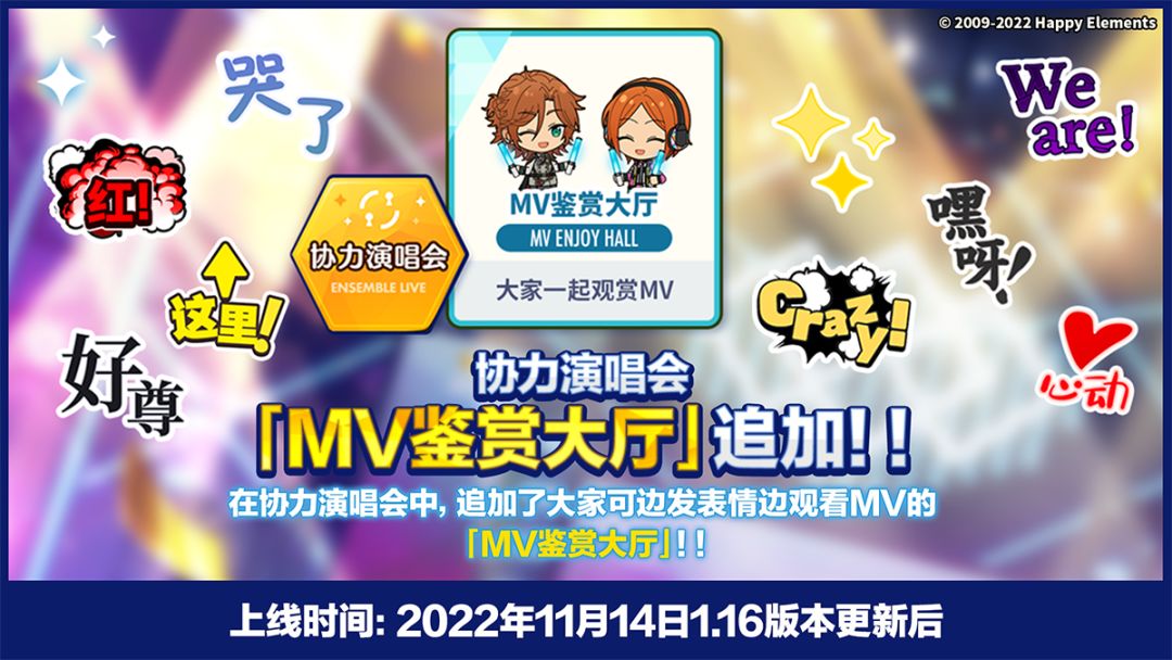11月14日版本更新后,游戏内将追加协力「MV鉴赏大厅」和活动BGM追加至ES硬币兑换所。