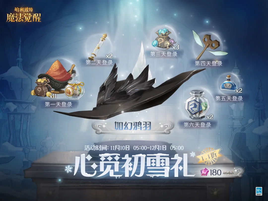 冬日特惠折扣,1.1折限时推出!购买后7日内每日可领好礼,累计登录7天可获得帽子「如幻鸦羽」(附赠异性款)。