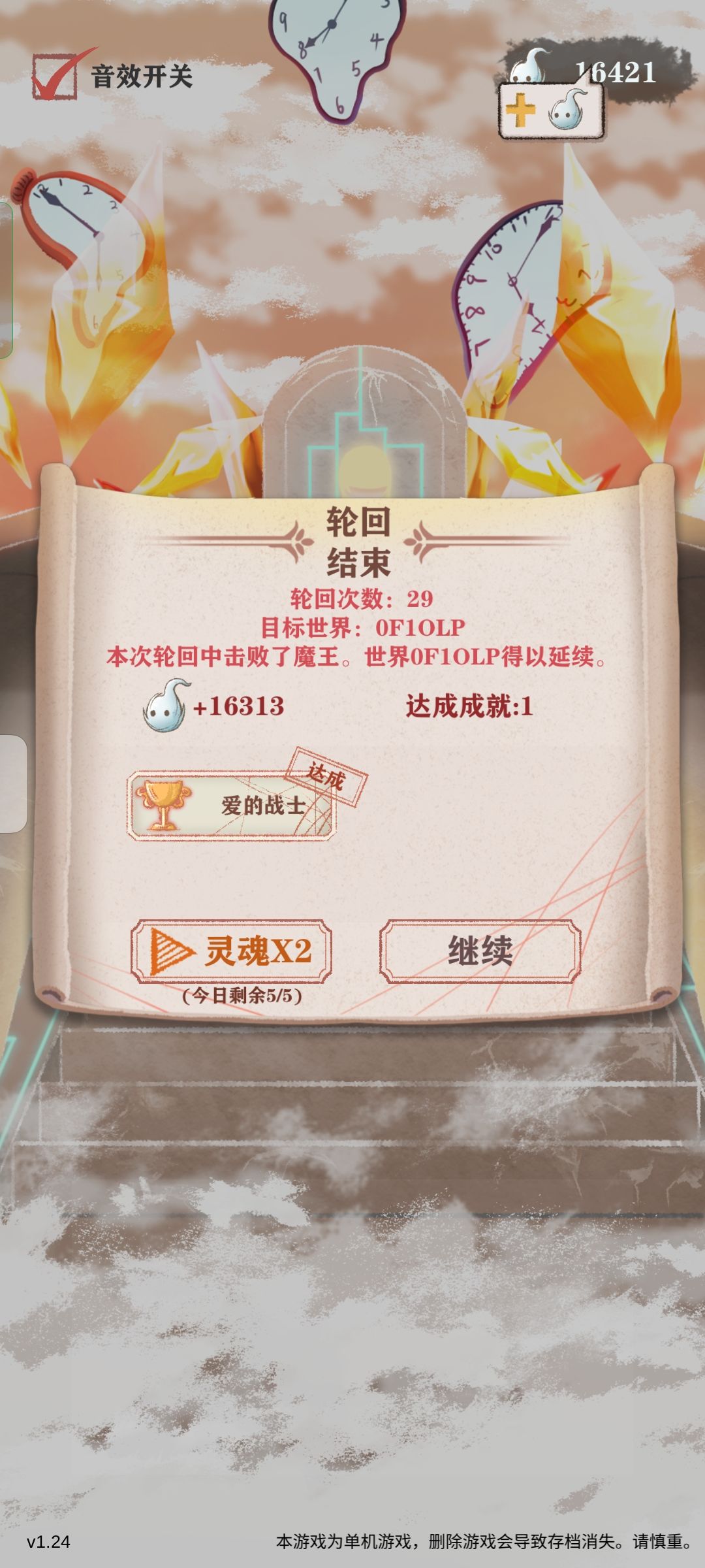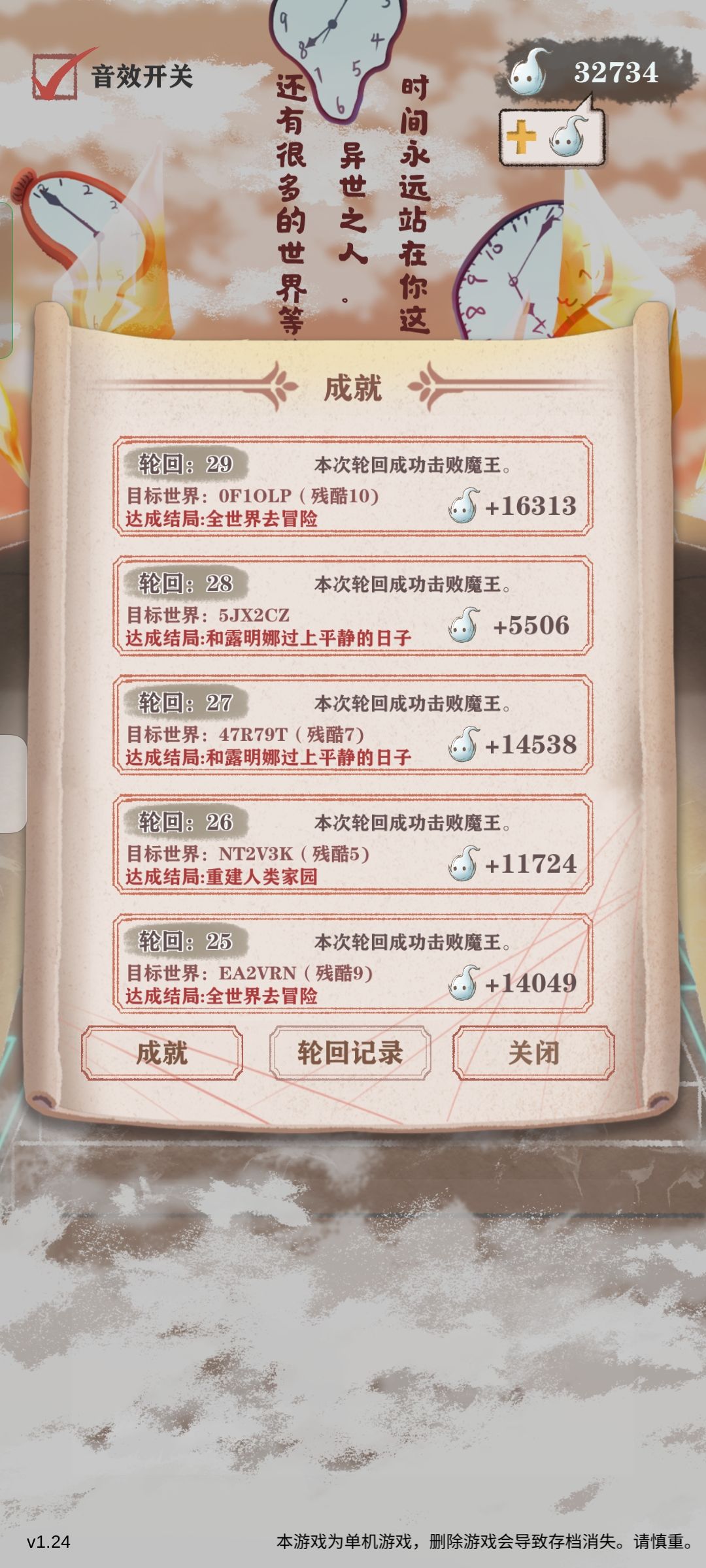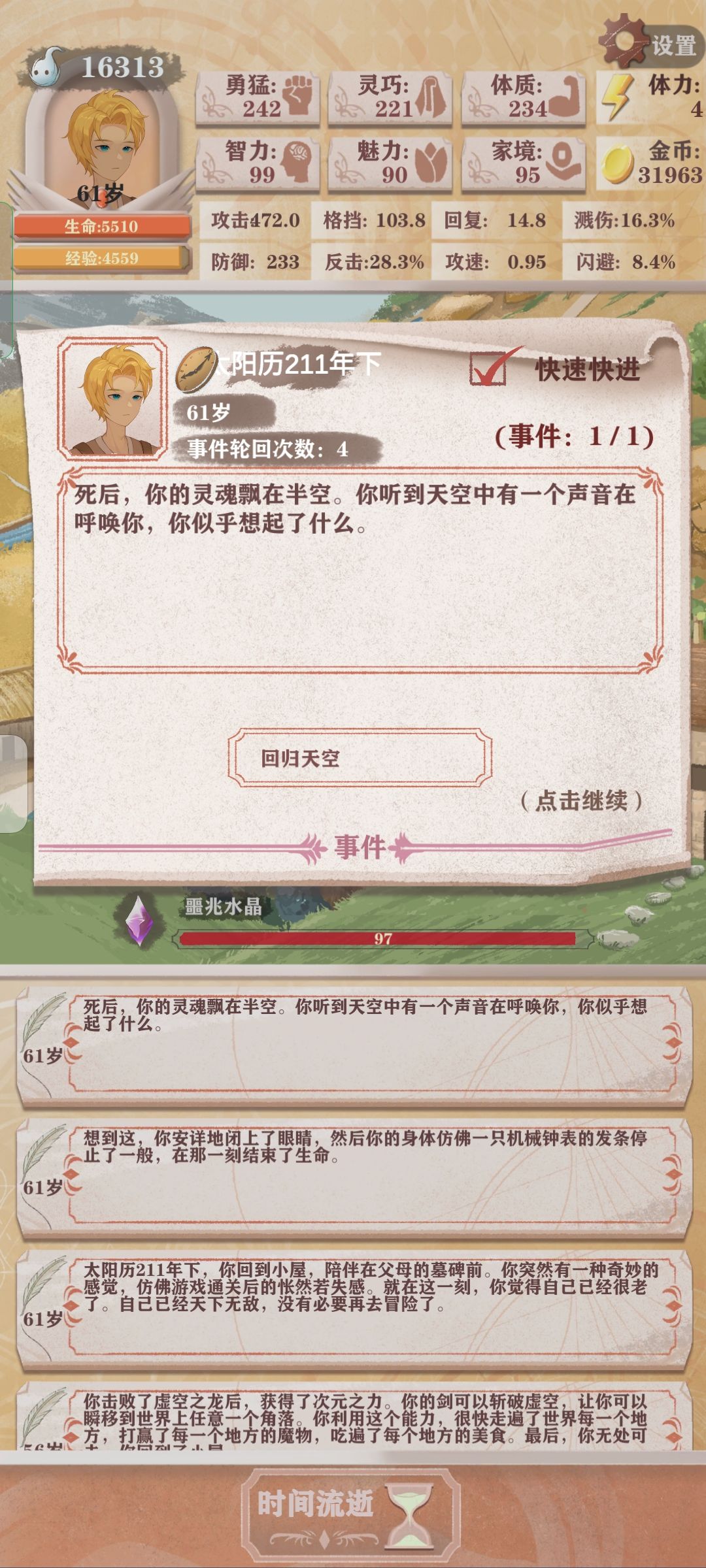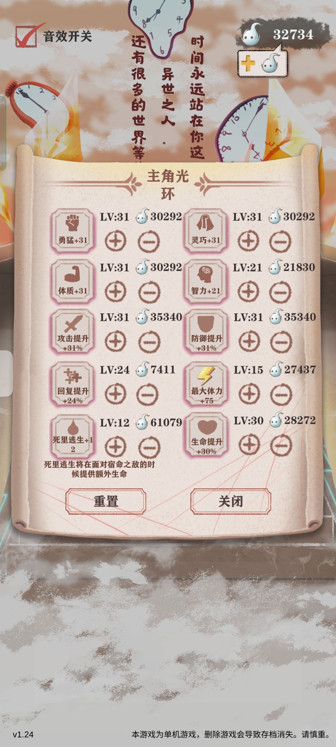 我最后这把打boss最终属性攻击800,防御接近400,103格斗53反击,14次死里逃生,路线很好三次死里逃生见到boss,(如果魔王眷属太多就sl找到合适的路线)最后打boss还剩四次死里逃生通关。结局选去世界冒险,男人的浪漫!第一次做这个游戏的攻略,如有不足,欢迎各位大佬指正。